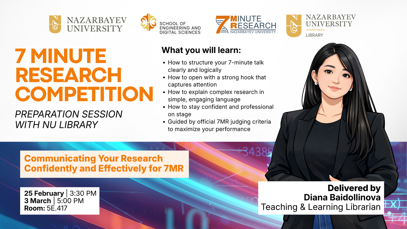 NU Library is pleased to invite participants of the 7-minute research (7MR) competition, organized by SEDS, to a series of special support sessions designed to help you communicate your research with clarity and confidence.