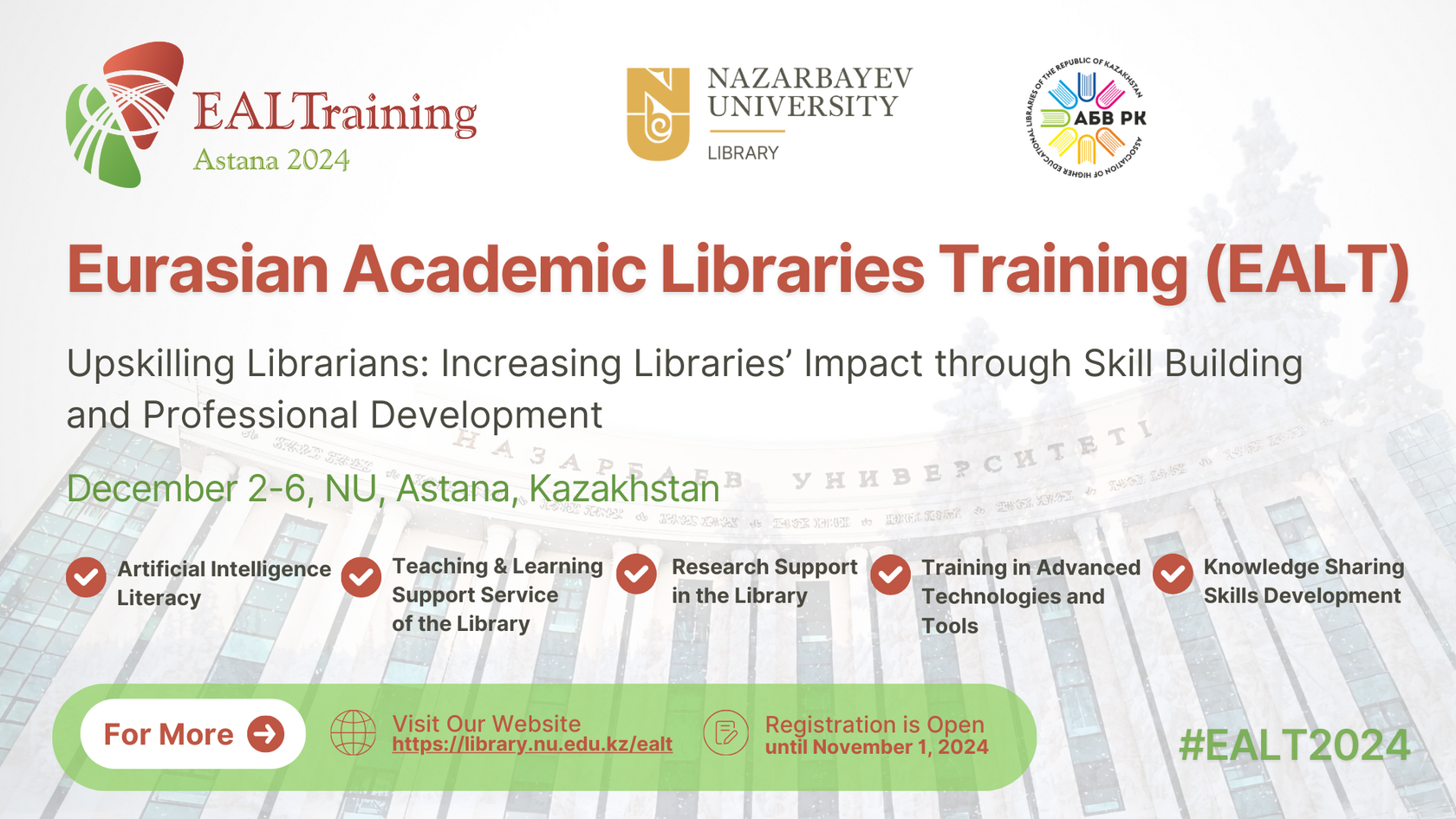 For more information, program details, and registration forms, visit NU Library website https://library.nu.edu.kz/ealt.