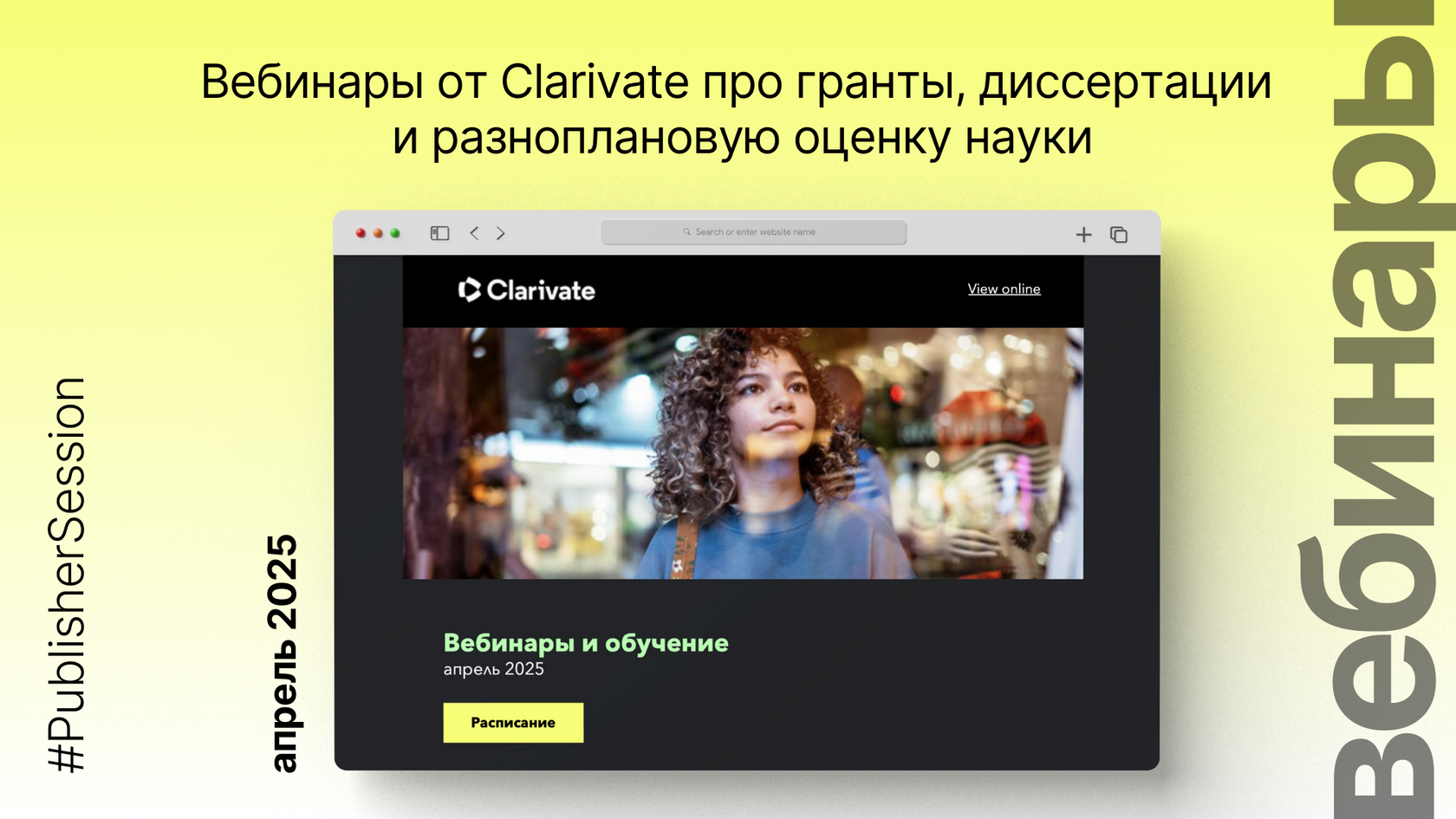 Проводите научные исследования более эффективно с бесплатными вебинарами от Clarivate на русском языке! Эксперты расскажут о поиске грантов, работе с диссертациями и разноплановой оценке науки.