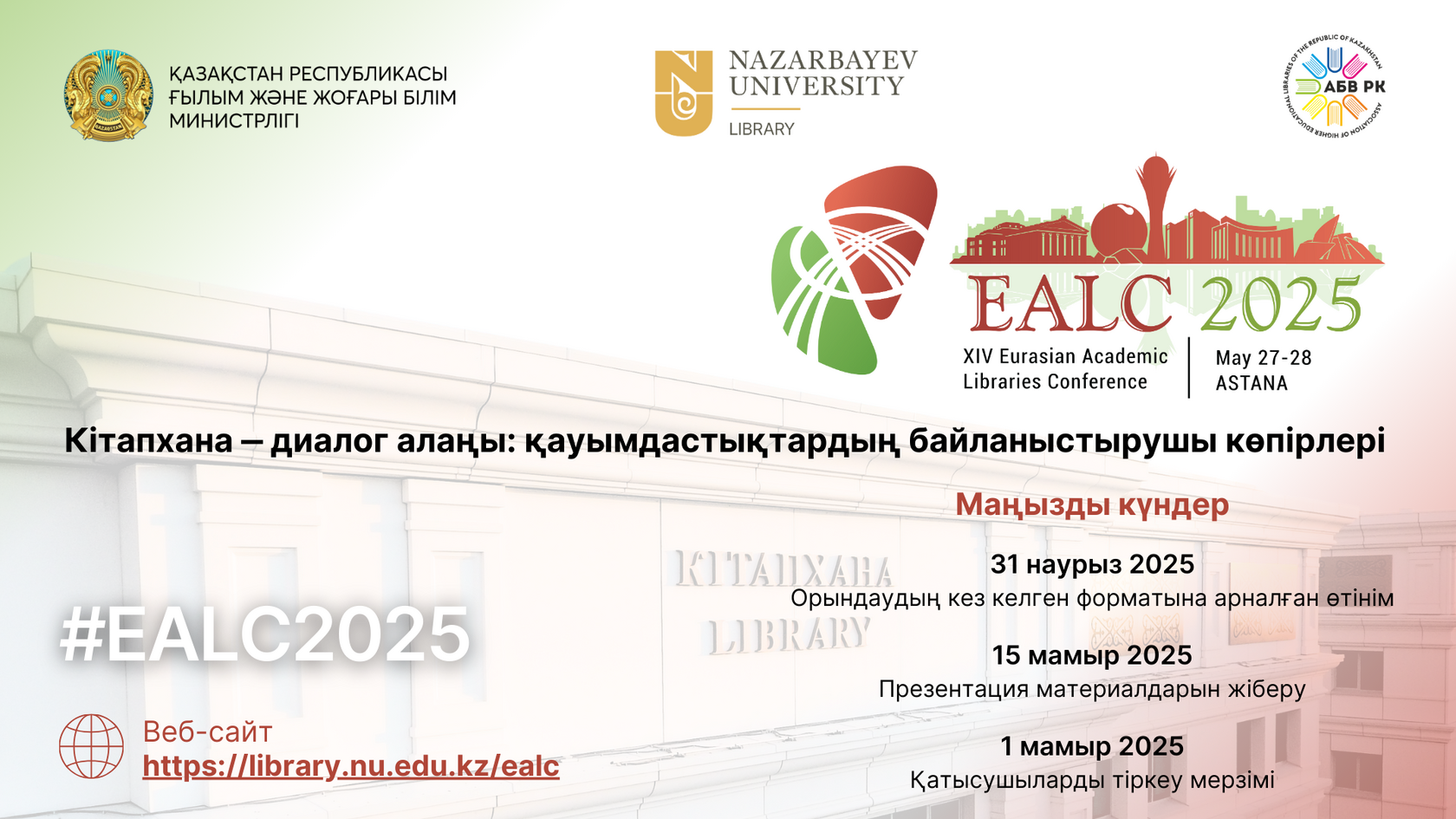 Назарбаев Университетінің Кітапханасы Қазақстан Республикасы Ғылым және жоғары білім министрлігі мен Қазақстан Республикасындағы университет кітапханалары қауымдастығының қолдауымен кітапхана және ақпарат мамандарын, зерттеушілерді және тәжіриберушілерді, сондай-ақ қазіргі уақытта кітапхана және ақпараттану бағдарламасын оқып жатқан немесе жақында ғана бітірген студенттерді 14-ші Еуразиялық академиялық кітапханалар конференциясына (EALC 2025) шын жүректен шақырады. Медициналық, арнайы, қоғамдық және мектеп кітапханаларының өкілдерін де қатысуға шақырамыз.
