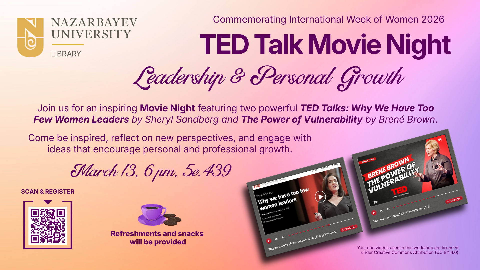 Join us for a TED Talk Movie Night as part of the Week of Women 2026, featuring two inspiring talks: Why We Have Too Few Women Leaders by Sheryl Sandberg and The Power of Vulnerability by Brené Brown. Discover powerful ideas about leadership, confidence, and authenticity while reflecting on perspectives that inspire personal and professional growth.